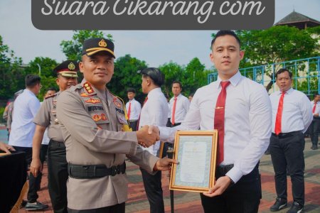 Polres Metro Bekasi melaksanakan apel pagi yang dirangkaikan dengan pemberian penghargaan kepada 67 personel berprestasi di Lapangan Apel Polrestro Bekasi, Selasa (30/9/2025).