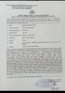 Dengan terlapor MIX PARLAY DKK, uraian kejadian Caria Heri Saputra selaku korban menerangkan bahwa awalnya pada hari Jumat tanggal 5 Desember 2025, Caria Heri Saputra mendapatkan informasi dari Saudara Dalim alias Genjo, saudara Imam dan Saudara Rahmat, kalau ada yang memposting status dengan kalimat “Sedikit info, karena tidak ada itikad baik saya hubungi ga ada respon” kalau berurusan ama orang ini,apalagi urusan gadai,bulan lalu saya gadai mobil ke dia,genap 1 bulan saya mau penebusan ternyata berbelit,hingga akhirnya saya tahu mobil sudah berpindah tangan dengan nominal 2X lipat,dan semua aksesoris mobil hilang,saya tunggu itikad baiknya ya bos, Denger-denger keluarganya ada yang mau nyalon lurah juga nih, dengan melampirkan photo KTP diri Caria Heri Saputra tanpa ijin dan tanpa sepengetahuannya, sehingga atas kejadian tersebut reputasi dan kehormatan diri Caria Heri Saputra menjadi tercemar dan merasa di rugikan, Caria Heri Saputra langsung melaporkan ke polres Kabupaten Bekasi untuk membuat pelaporan guna penyelidikan lebih lanjut, dan sudah jelas ini sudah melanggar Undang-Undang ITE denga KUHP 310 dan KUHP pasal 27 ayat 1.