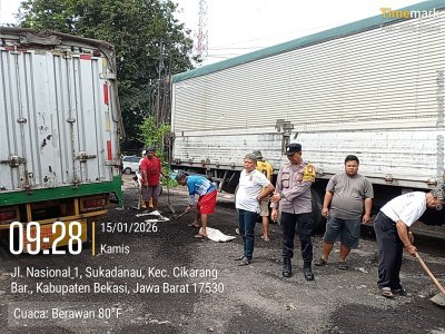 Dalam rangka menjaga keamanan dan ketertiban masyarakat (Harkamtibmas), Bhabinkamtibmas Desa Danau Indah Polsek Cikarang Barat, Aiptu Abdul Kohar, melaksanakan kegiatan kunjungan dan kerja bakti penambalan jalan raya bersama aparatur desa dan warga, Kamis (15/1/2026).