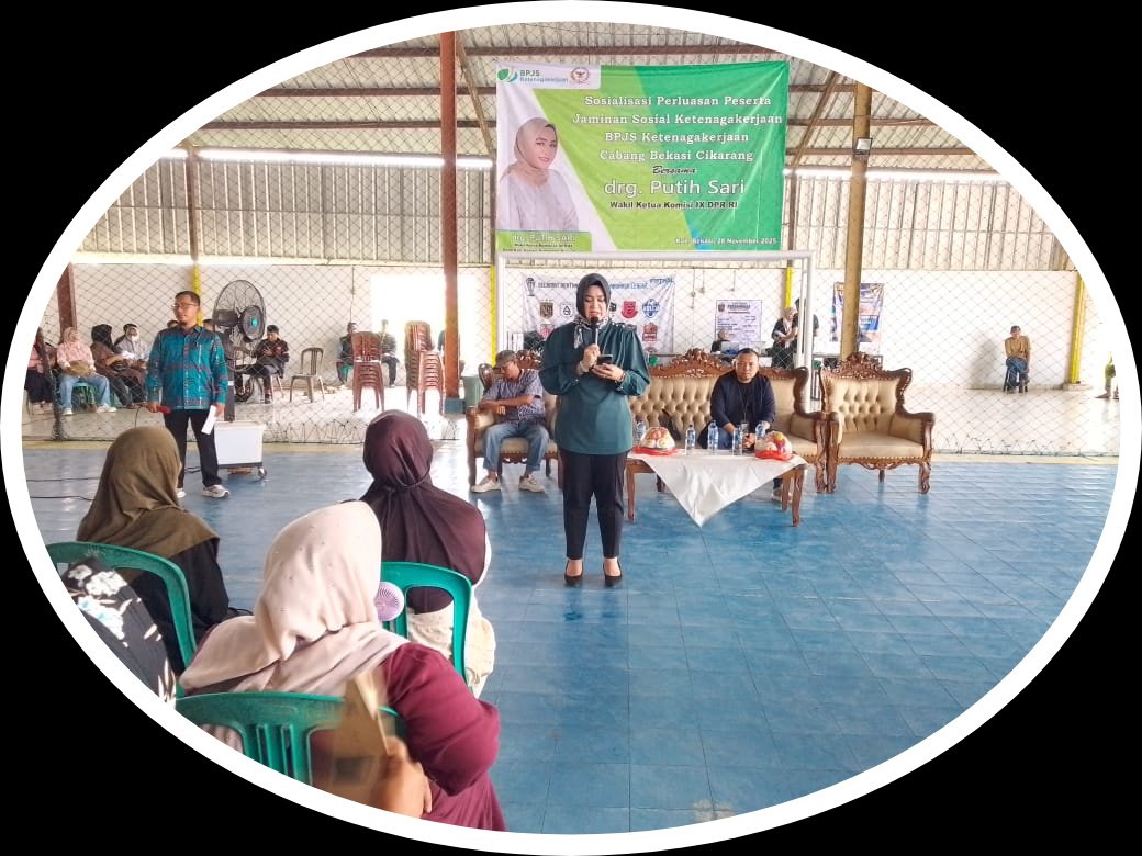 Wakil Ketua Komisi IX DPR RI Fraksi Partai Gerindra, Drg. Putih Sari bersama BPJS Ketenagakerjaan Cabang Bekasi Cikarang melakukan kegiatan Sosialisasi Perluasan Peserta Jaminan Sosial Ketenagakerjaan kepada masyarakat Cikarang Utara dan sekitarnya di Feny Futsal Jalan Kihajar Dewantara, Desa Karangasih, Kecamatan Cikarang Utara, Kabupaten Bekasi, Jawa Barat. Pada Jumat (28/11/2025).