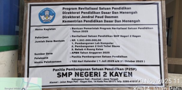 Dugaan adanya penyelewengan dalam proyek revitalisasi pembangunan di SMP Negeri 2 Kayen kabupaten Pati semakin menguat. Proyek yang seyogyanya dikerjakan secara swakelola namun pelaksanaannya dilapangan diduga dikerjakan melalui pihak ketiga. Adapun nilai proyek revitalisasi yang seharusnya dikerjakan secara swakelola namun diduga dikerjakan oleh pihak ketiga tersebut senilai Rp 1.555.000.000 yang bersumber dari dana APBN tahun anggaran 2025 ini, yang mencakup pembangunan laboratorium komputer, dua unit toilet siswa, dan rehabilitasi empat ruang kelas, kini tengah dipertanyakan transparansi dan akuntabilitasnya oleh berbagai pihak.