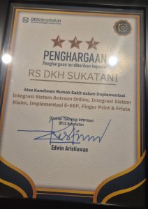 RS DKH Sukatani meraih penghargaan dari BPJS Kesehatan sebagai bentuk apresiasi atas keberhasilan rumah sakit tersebut dalam mengintegrasikan sistem layanan kesehatan berbasis digital guna meningkatkan kualitas pelayanan kepada masyarakat.